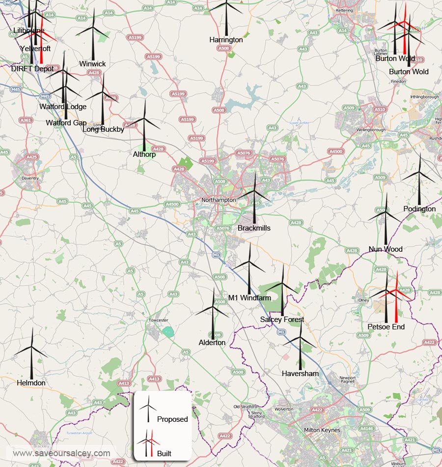 Due to lucrative indirect subsidies, several multi-national power companies are targeting this area to site wind turbines. Up to 100 could be encircling the countryside to the north of Milton Keynes if all the proposals go ahead! -see MAP